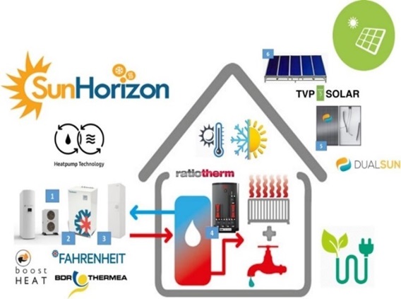 SunHorizon is a demonstration to market project where the combination of 5 H&C technologies (Ratiotherm, BDR, BoostHeat, DualSun, TVP solar) in 5 technology packages will be demonstrated in 8 demosites all around Europe (Germany, Spain, Latvia, Belgium). A Cloud based functional monitoring platform will be implemented as well in order to: