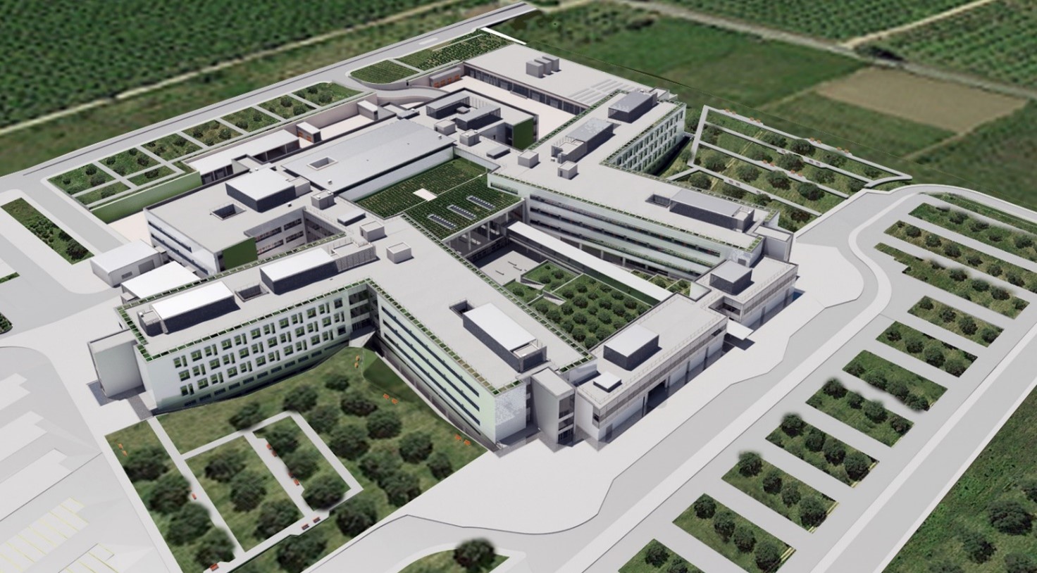Il modello del nuovo ospedale si compone di quattro corpi principali organizzati intorno a una corte verde articolata su due livelli da un percorso che conduce all’atrio centrale, vero cuore del sistema.